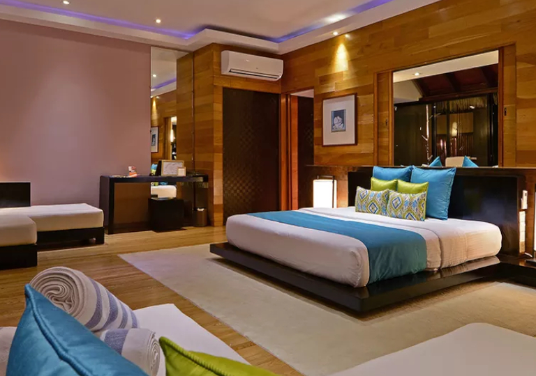 -Water Villa: 44 prestigiose abitazioni di 91 mq. Situate sulla laguna dispongono di un bagno di 24 mq. con jacuzzi all’aperto. Televisione , pavimento in cristallo per ammirare i pesciolini! Terrazza di 27 mq. , piscina privata. Maggiordomo privato, SPA e possibilita’ di consumare la colazione in camera.