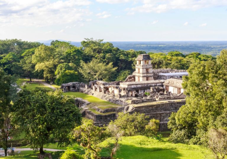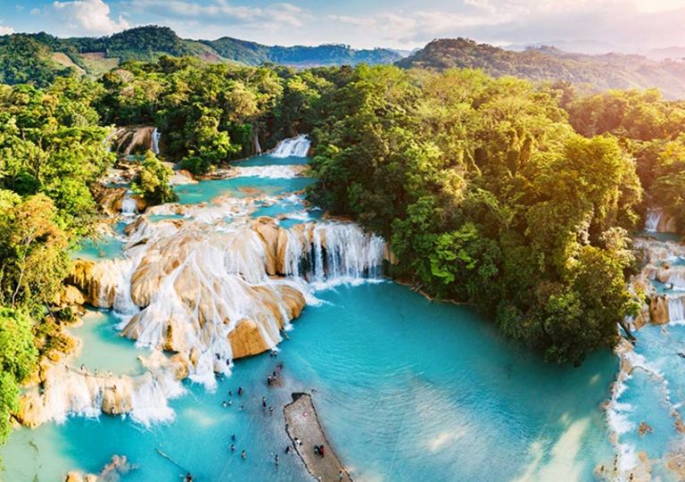 Partenza per Palenque attraversando la bellissima e verdissima sierra con breve sosta alle Cascate di ‘Agua Azul’ per un pranzo al sacco o in ristorante rustico. Sistemazione e pernottamento presso l’hotel Villa Mercedes di Palenque o similare. Pernottamento.