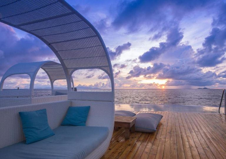 Affiancato da numerose piccole spiagge private che fanno parte della grande baia di Anse Bois de Rose. Gli ospiti hanno sempre accesso ad ampie aree prendisole; grandi terrazze di sabbia; amache con palme e lettini.