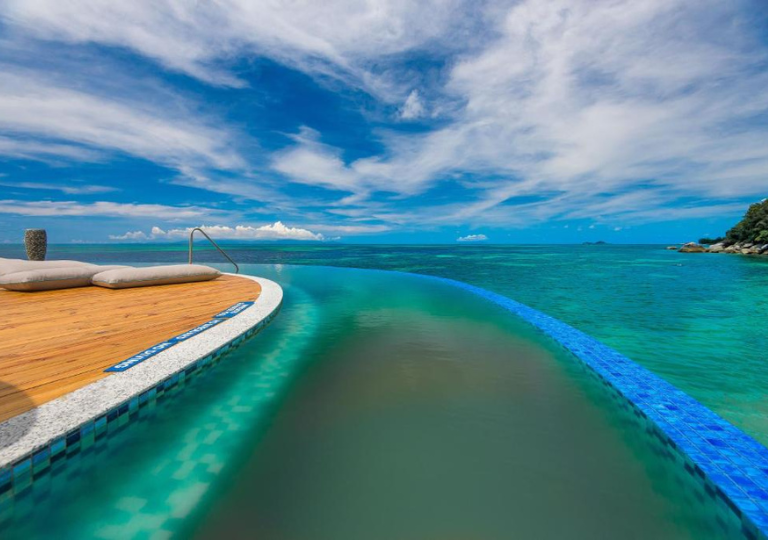 Le due magnifiche piscine, una dalla forma unica di Coco de Mer, si affacciano sull'Oceano Indiano e l'altra, arroccata su uno sperone di granito con vista a 270 gradi sull'oceano, sulle Black Parrot Junior Suites.