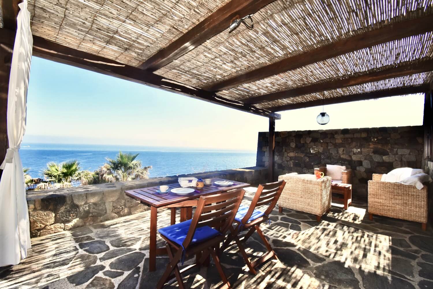Descrizione: Un dammuso sul mare con un ampio patio esterno per godere del suono delle onde, ideale per coppie. Caratterizzato da un romantico ambiente con letto matrimoniale, zona living e cucina. Gli spazi esterni offrono ombra e comfort per momenti di relax e pasti all'aperto.