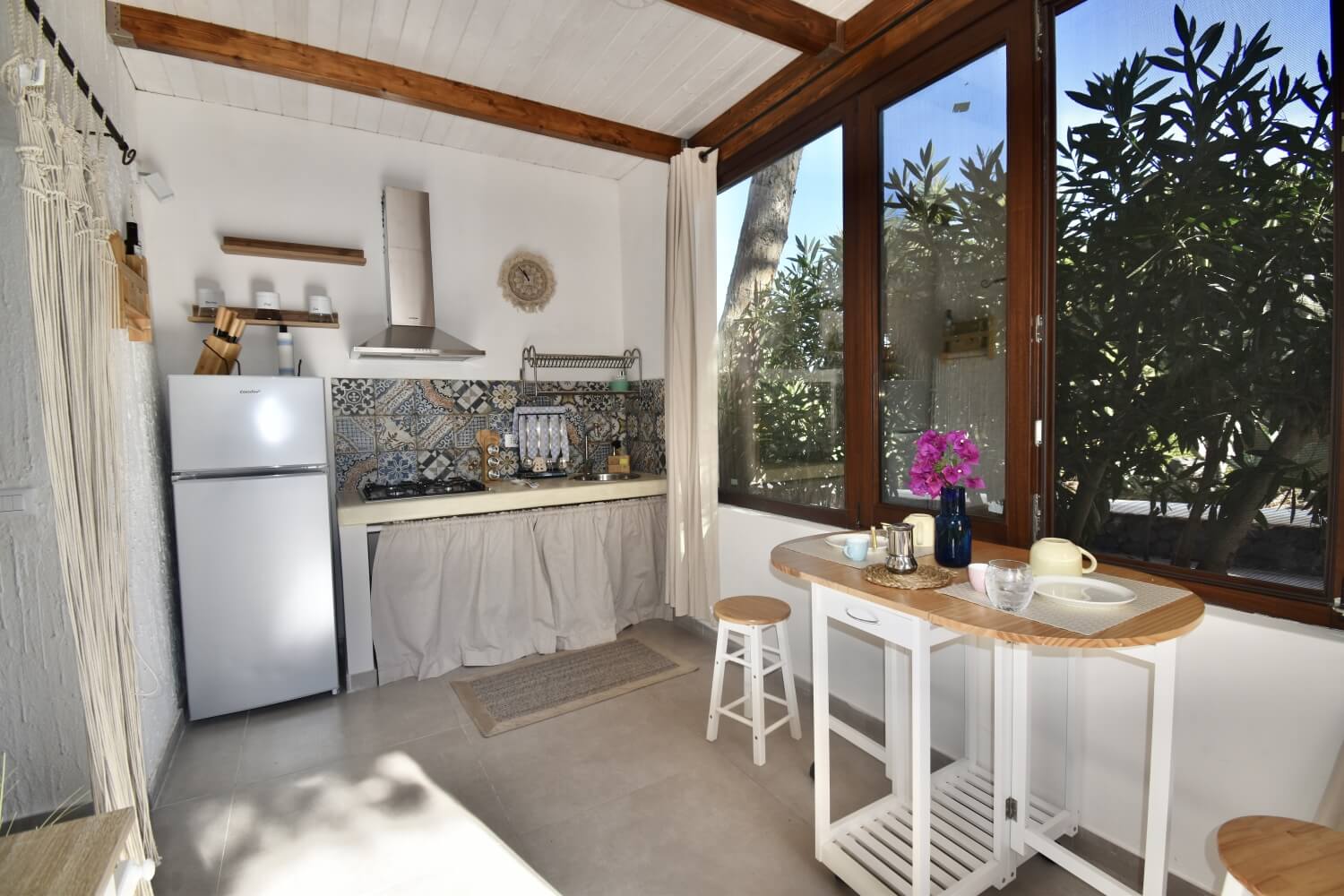 Ancor più interessanti sono gli spazi esterni: i terrazzamenti che tagliano i terreni, le verdi vigne, i bassi e larghi uliveti, le coloratissime bouganvillee e le longilinee palme arricchiscono i giardini e fanno da cornice a queste case.