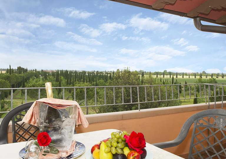 Il balcone arredato è perfetto per una piacevole pausa relax con vista sullo splendido giardino interno o sull’incantevole campagna toscana che sprigiona un mix inconfondibile di profumi che renderanno la vostra vacanza indimenticabile.