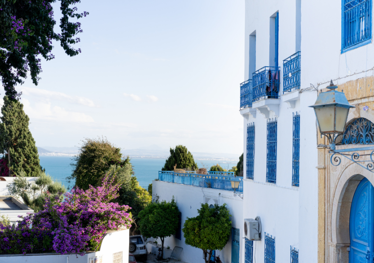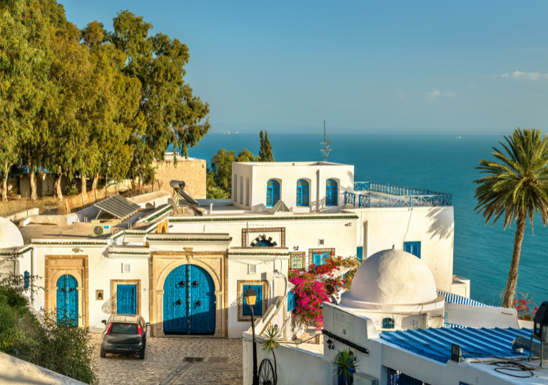Sidi Bou Said ricorda un villaggio di artisti, è un luogo di rara bellezza dove dominano i colori. Le case sono di un bianco variopinto e sulle facciate spiccano persiane e porte decorate blu. Un luogo incantevole la cui bellezza è enfatizzata da rigogliose bouganville che donano un energico tocco magenta.