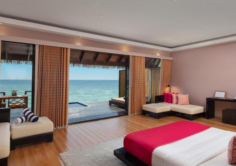 -Water Villa: 44 prestigiose abitazioni di 91 mq. Situate sulla laguna dispongono di un bagno di 24 mq. con jacuzzi all’aperto. Televisione , pavimento in cristallo per ammirare i pesciolini! Terrazza di 27 mq. , piscina privata. Maggiordomo privato, SPA e possibilita’ di consumare la colazione in camera.
