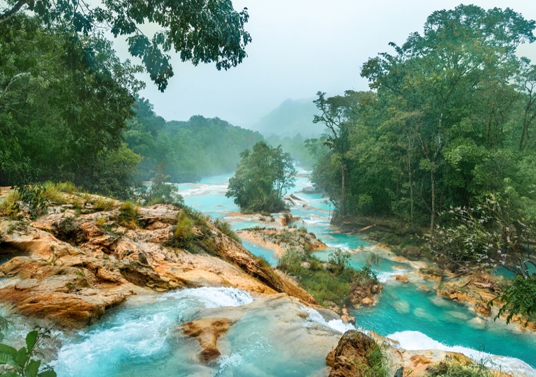Partenza per Palenque attraversando la bellissima e verdissima sierra con breve sosta alle Cascate di "Agua Azul". Registrazione e pernottamento all’hotel Villa Mercedes Palenque o similare..