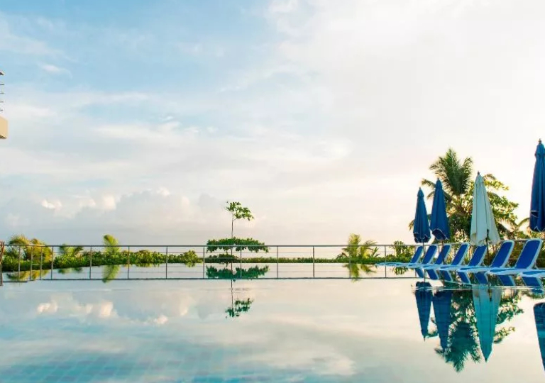 Grazie all’intelligente stile architettonico, la maggior parte dei balconi delle camere sono posizionati in modo tale da dare direttamente sulle acque turchesi dell’oceano. Questo straordinario colore è dovuto alla leggera pendenza con cui la spiaggia di sabbia bianca lascia il posto al mare. La vista dai balconi delle ville è effettivamente senza eguali e regala un panorama mozzafiato.