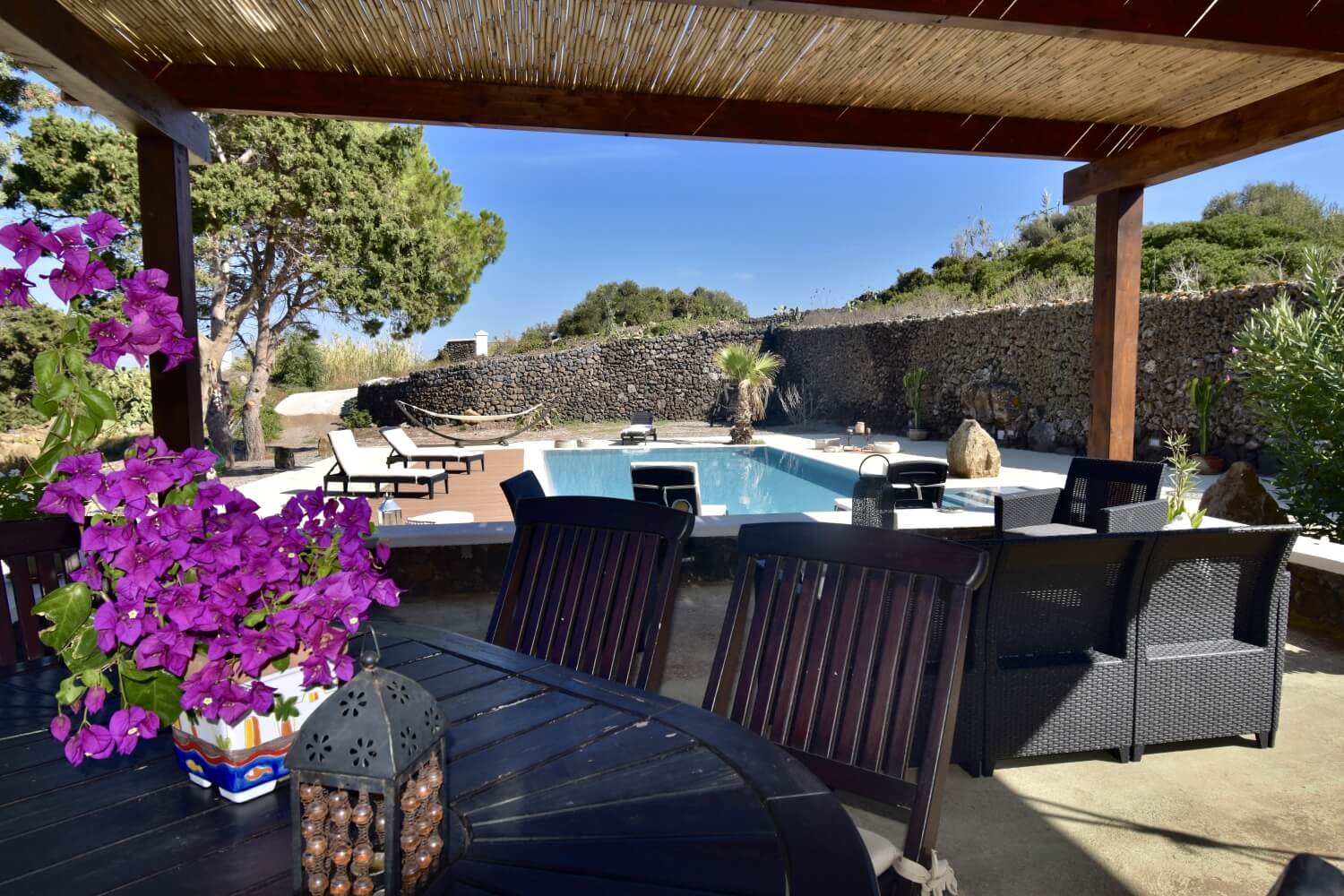Ancor più interessanti sono gli spazi esterni: i terrazzamenti che tagliano i terreni, le verdi vigne, i bassi e larghi uliveti, le coloratissime bouganvillee e le longilinee palme arricchiscono i giardini e fanno da cornice a queste case.