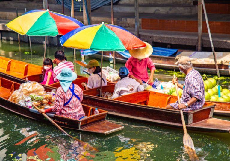 Partenza dall’hotel ore 07:30 in minivan verso la provincia di Samut Songkhram, a circa 70 km da Bangkok. Come prima tappa si visiterà la stazione ferroviaria di Mae Khlong, famosa per il mercato che si sviluppa lungo i binari, dove si potrà assistere al passaggio del treno tra le bancarelle. Dopo la visita, ci si sposterà nella provincia di Ratchaburi, a circa 20 km a nord, per raggiungere il Mercato Galleggiante di Damnoen Saduak. A bordo di una motolancia si navigheranno i canali fino al mercato, animato da numerose barche colme di prodotti. Dopo una sosta per esplorare il mercato, si rientrerà a Bangkok nel primo pomeriggio. Resto della giornata libero. Cena libera e pernottamento in hotel.