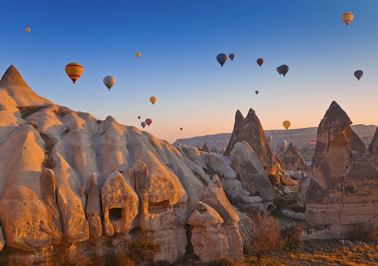 Possibilità di partecipare alla gita in mongolfiera per ammirare dall’alto il paesaggio lunare e mozzafiato della Cappadocia illuminata dalle prime luci dell’alba (facoltativa, a pagamento e in base alla disponibilità dei posti. Tale gita può essere annullata anche poche ore prima dell’inizio a causa di avverse condizioni meteorologiche). Prima colazione in hotel. Visita del Museo all’aperto di Goreme, la più spettacolare e famosa tra le valli della Cappadocia, disseminata di colonne rocciose intagliate nel tufo che prendono il nome di "camini delle fate" perché conferiscono alla valle un aspetto fiabesco; della Valle di Devrent, dove il tempo ha eroso la roccia formando dei picchi, dei coni e degli obelischi e di una cooperativa locale dove sarà possibile scoprire tutti i segreti della lavorazione dei famosi tappeti turchi in esposizione con possibilità facoltativa di acquisto e spedizione. Pranzo in ristorante. Visita di Ozkonak (o Saratli), uno dei complessi rifugi sottoterra conosciuti come “città sotterranee”; della Cittadella di Uchisar, situata all’interno di un cono di roccia tufacea e di un laboratorio per la lavorazione di pietre dure, oro e argento. Trasferimento per il rientro in hotel. Cena in hotel e pernottamento. Possibilità di partecipare alla serata folkloristica (facoltativa, a pagamento) con danzatrice del ventre.